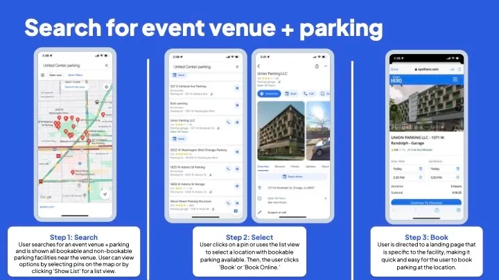 - Event Parking: Book spots at sports arenas, concert venues, and other event locations.